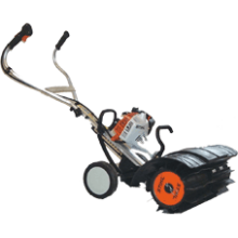 Motordriven sopmaskin med hjul och gummivals för skräp, löv, snö, grus etc. på jämna ytor.
